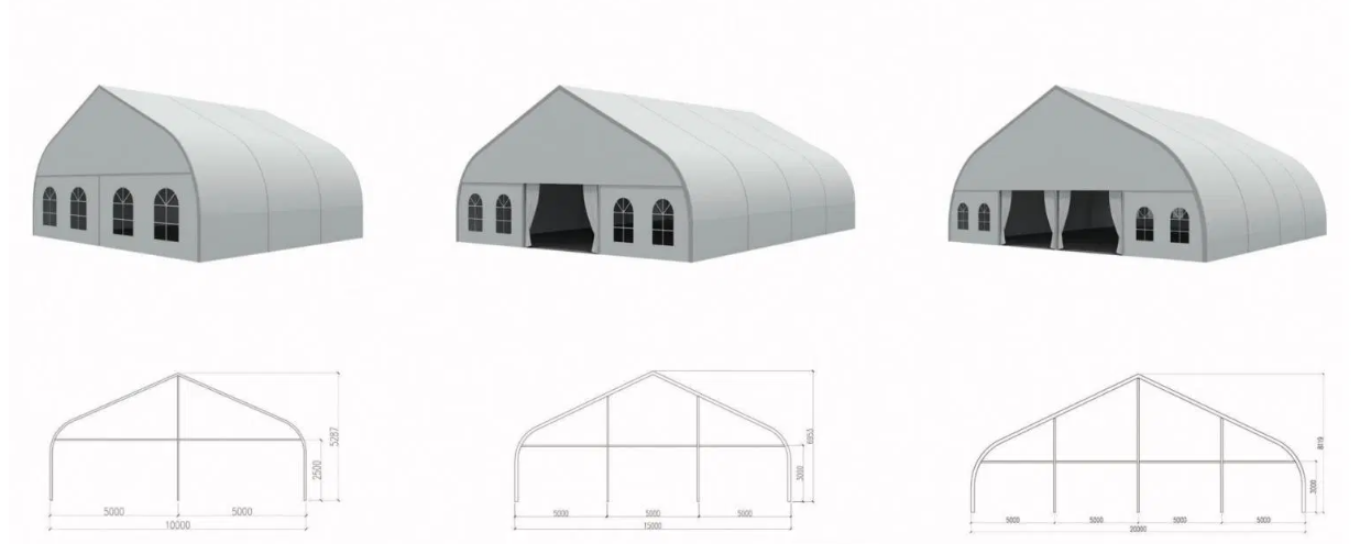 Our tents can be assembled and dismantled and repeatedlly with small transporation distance. The lifespan of aluminum framework can reach 15-20years, and 5-8 years for PVC fabrics depending on different conditions of usage.