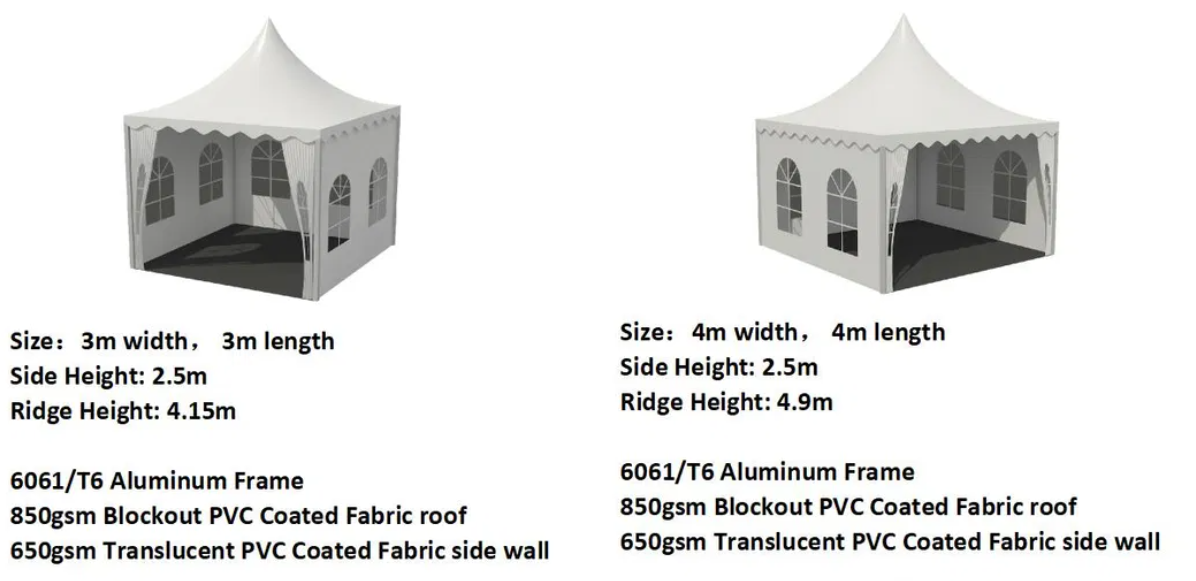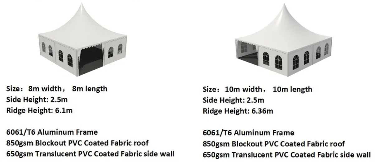 Cover material : 850 g/sqm for roof, 650 g/sqm for walls , Double PVC-Coated Polyester