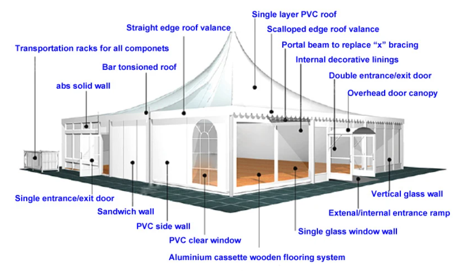 A: Our tents can be assembled and dismantled easily and repeatedly with small transportation size.The lifespan of aluminum framework can reach 8-10 years, and 4-6 years for PVC fabrics depending on different conditions of usage.